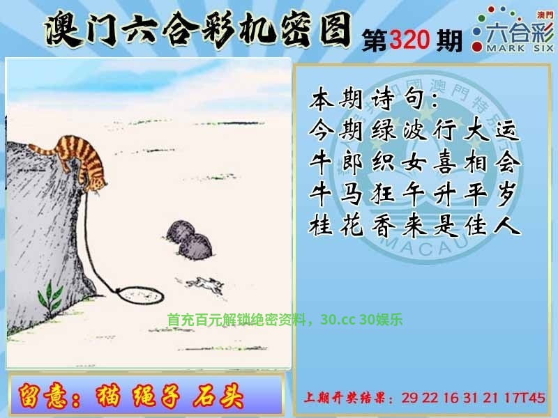 | 今期绿波行大运,牛郎织女喜相会,牛马狂午升平岁,桂花香来是佳人。 |